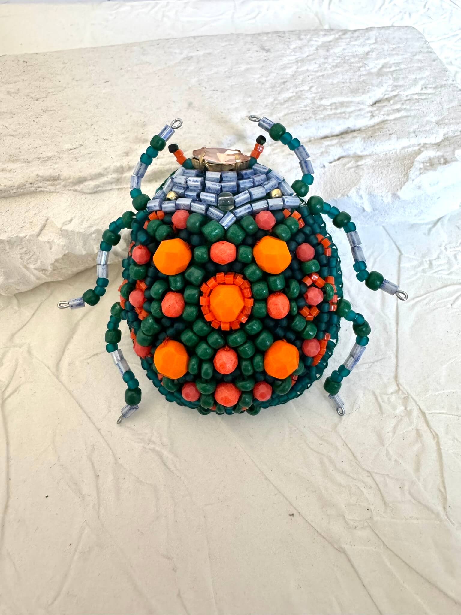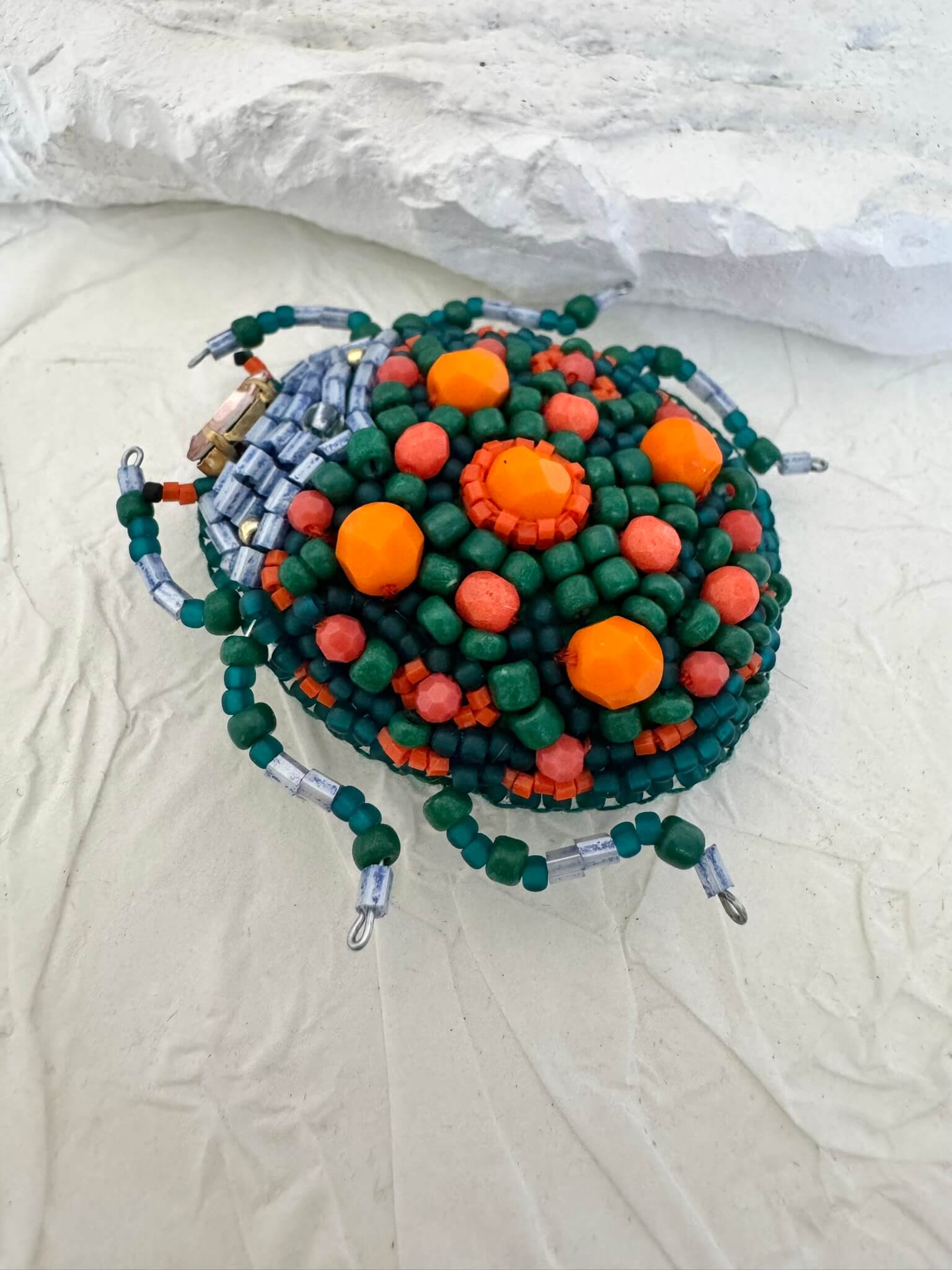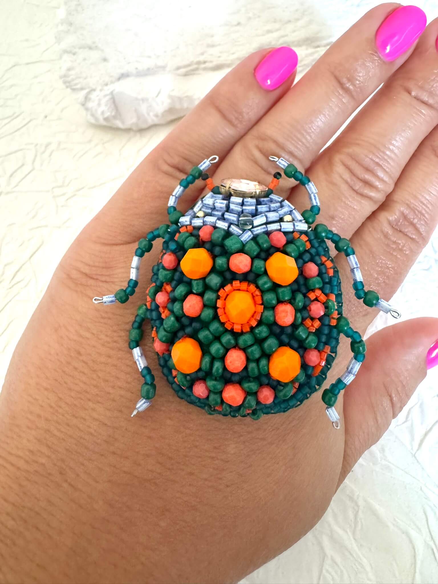 Ręcznie wyhaftowana broszka w kształcie chrząszcza, stworzona z koralików w odcieniach zieleni, pomarańczu i niebieskiego.