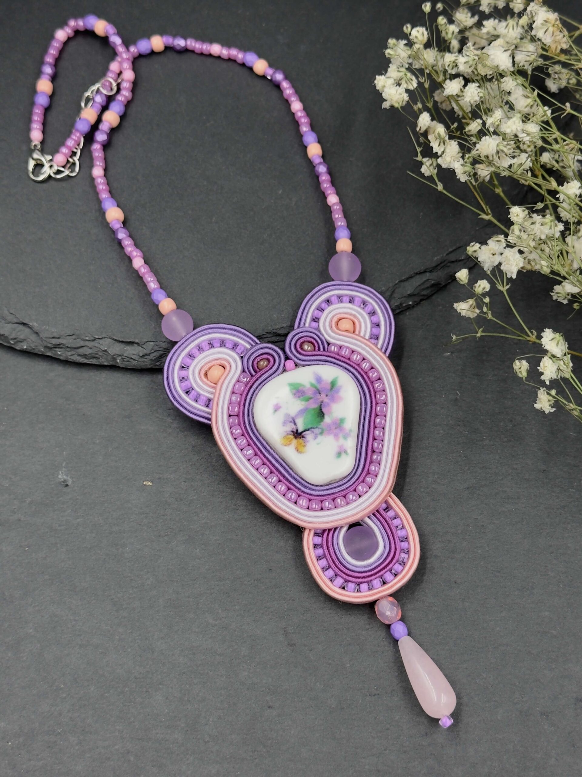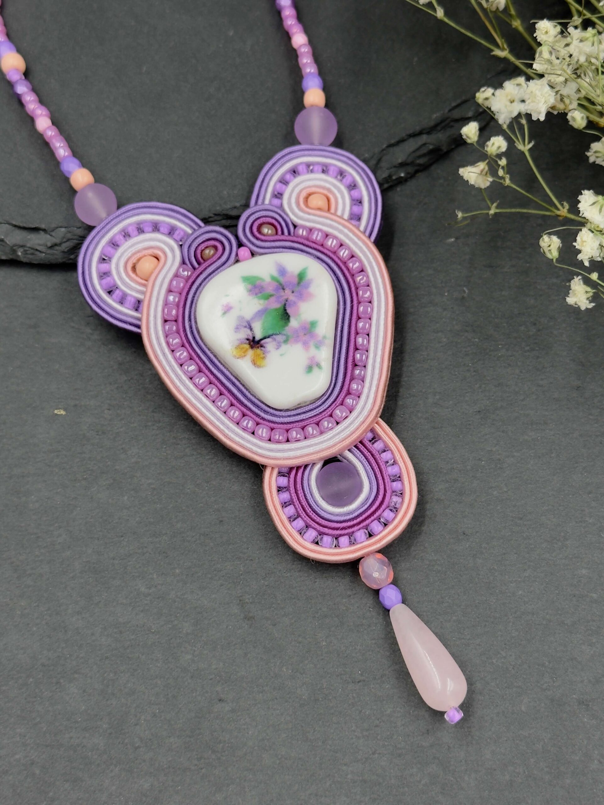 Ten wisior sutasz pastelowy został wykonany ręcznie z dbałością o każdy detal. W centralnej części znajduje się ceramiczny kaboszon z delikatnym motywem kwiatowym, który nadaje biżuterii romantyczny charakter. Całość utrzymana jest w pastelowych odcieniach fioletu, lawendy i pudrowego różu.